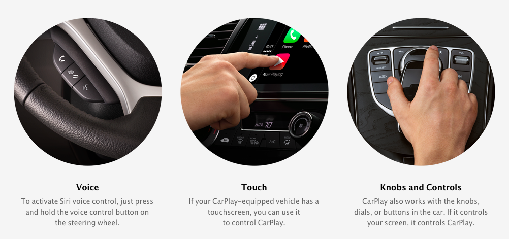 在 CarPlay 介绍页面里出现了三种操控方式:语音 (Siri)、触控、旋钮等实体按键控制。语音控制就不多啰嗦了,Siri 在 iPhone 上有多大能耐,估计在 CarPlay 模式下也差不多。有一点特别值得赞赏,苹果和车厂合作,在方向盘上加入了 Siri 启用按钮,长按说话即可。看到有微博评论说,“Google Now 已经不需要按钮激活语音控制了,Siri 还需要按个按钮,实在是需要改进。” 我就不在这里吐槽了,请想象,车上载了一个过于活泼的熊孩子会是什么情况。